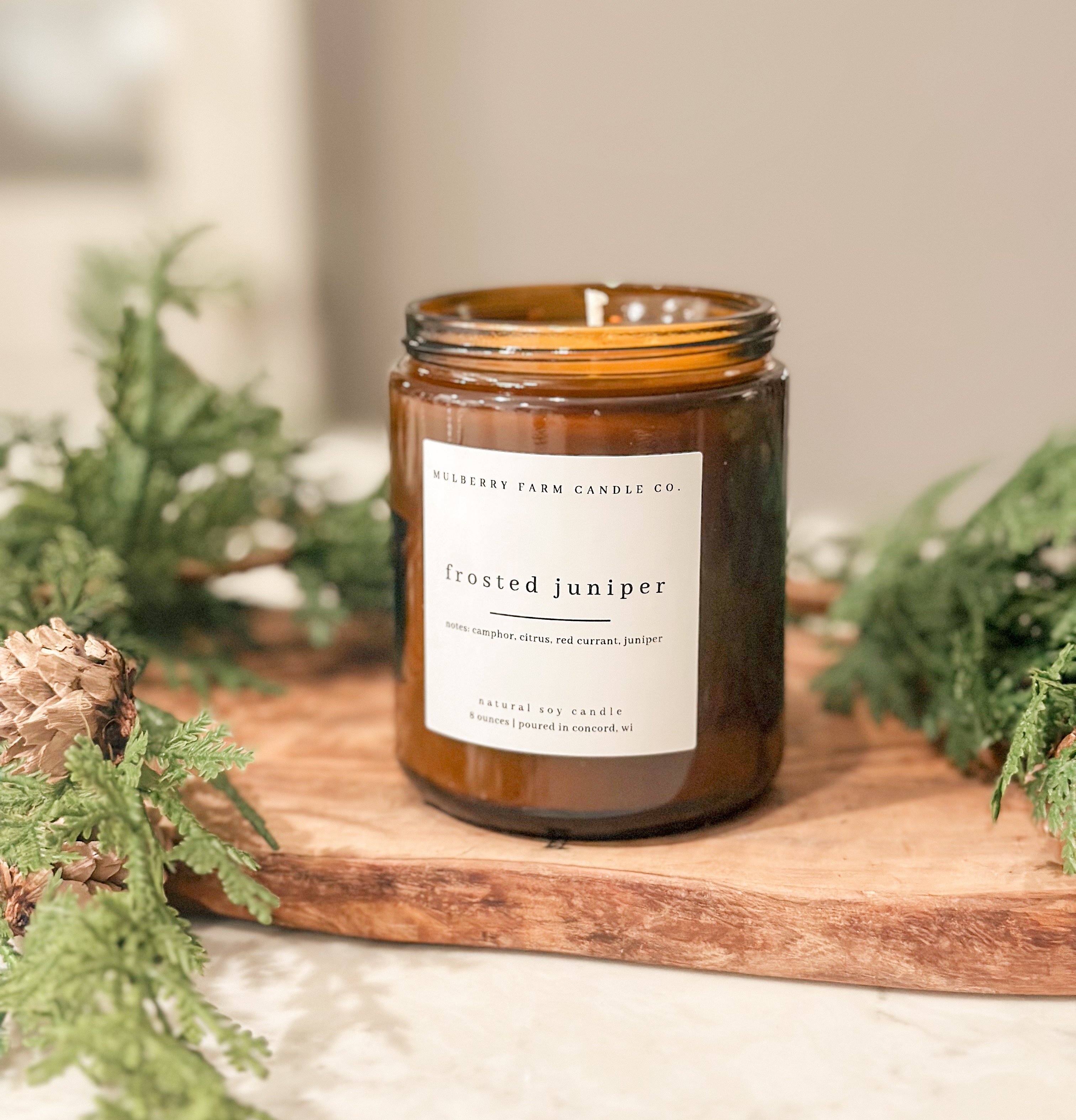 Frosted Juniper is an enchanting blend of fresh evergreens and fruits. Cooling camphor, airy ozone, and a hint of citrus start off this complex winter scent. Middle notes of deep red berry balance the woody pine and juniper notes. The fresh evergreen notes are reinforced by eucalyptus, fir needle, and cedar leaf essential oils.